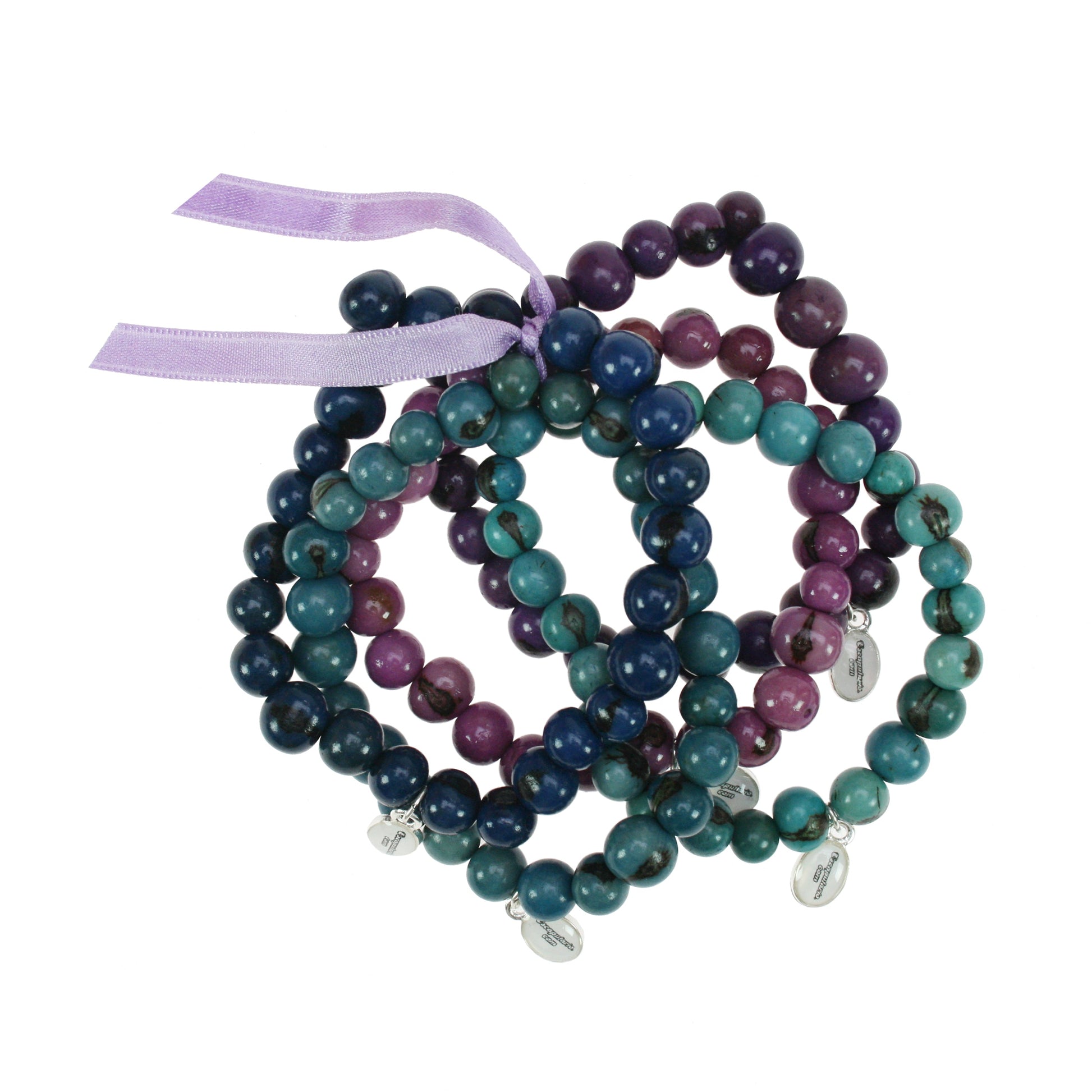 Armband-Set, bestehend aus fünf einzelnen in blau, jeans, violett, türkis und flieder gehaltenen Escapulario Armbändern. Als Perlen dienen hier die unregelmäßigen Samenkörner der Acai-Frucht, die asymmetrisch gelocht sind und daher aufgefädelt eine bewegte Reihe bilden.