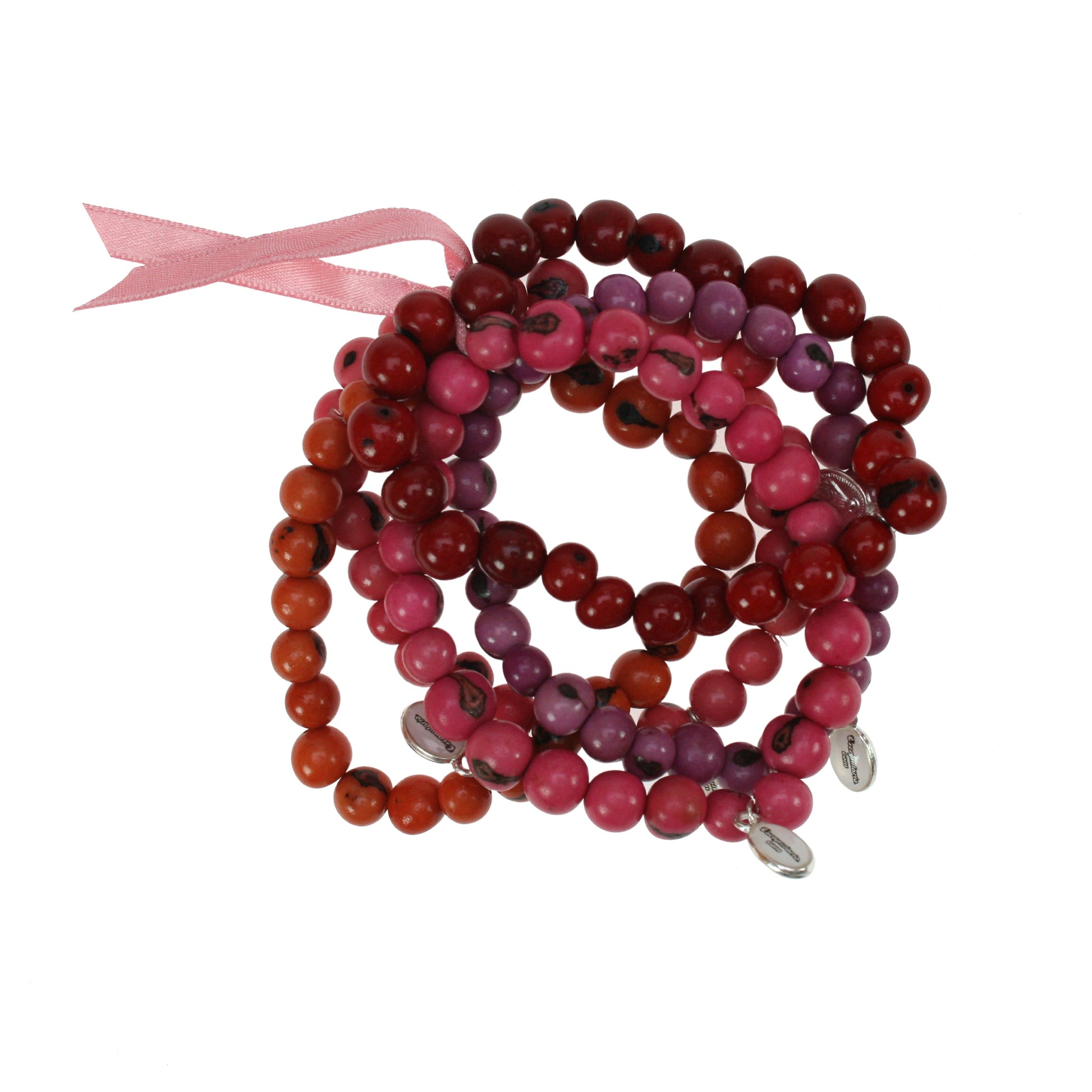 Armband-Set, bestehend aus fünf einzelnen in pink, rot, bordeaux, orange und rosé gehaltenen Escapulario Armbändern. Als Perlen dienen hier die unregelmäßigen Samenkörner der Acai-Frucht, die asymmetrisch gelocht sind und daher aufgefädelt eine bewegte Reihe bilden.