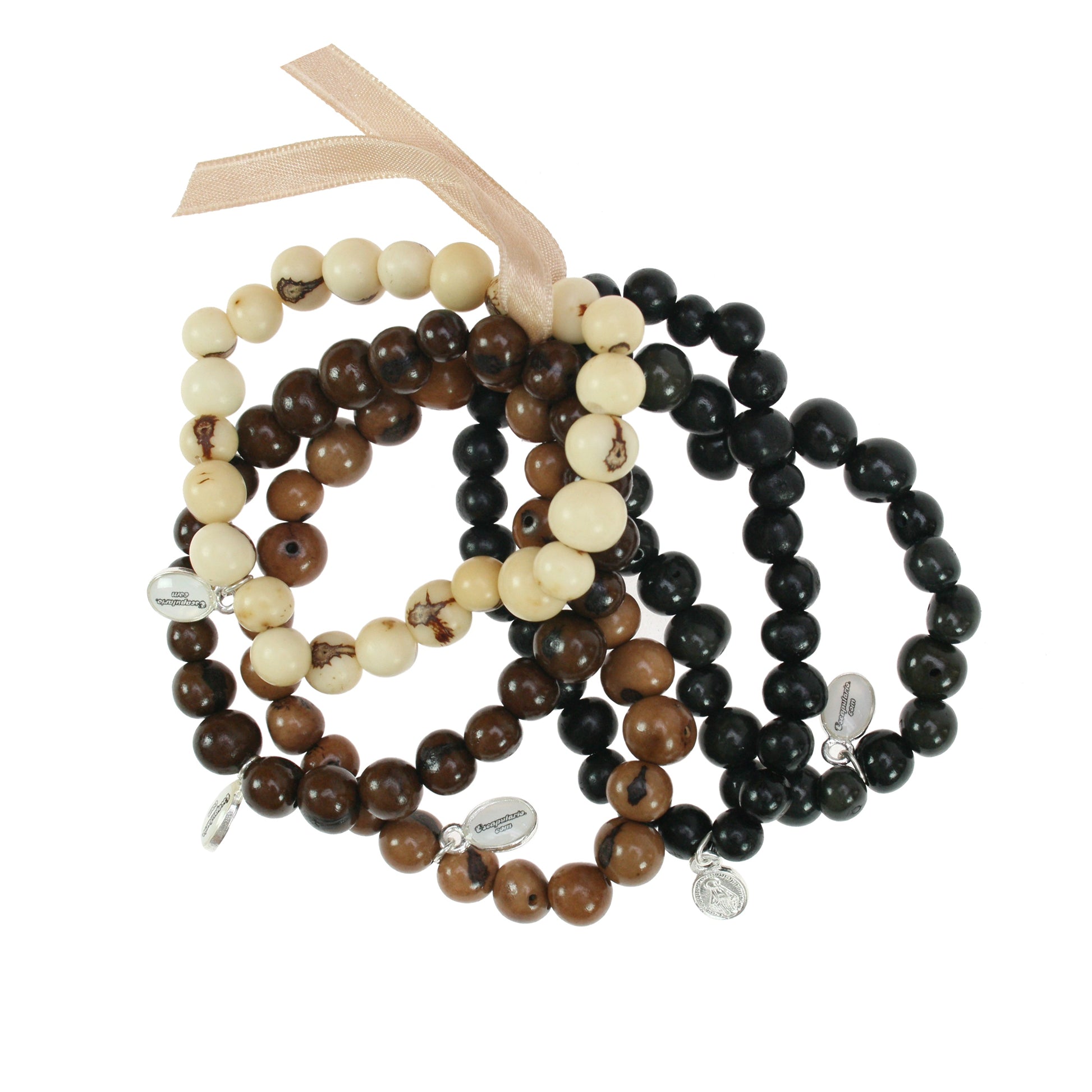 Armband-Set, bestehend aus fünf einzelnen in braun, hellbraun, grau, schwarz und beige gehaltenen Escapulario Armbändern. Als Perlen dienen hier die unregelmäßigen Samenkörner der Acai-Frucht, die asymmetrisch gelocht sind und daher aufgefädelt eine bewegte Reihe bilden.