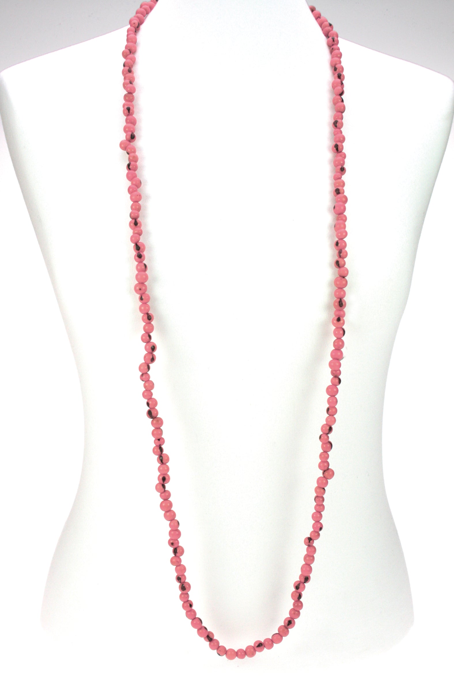 Etwas ganz Besonderes ist diese organisch anmutende, monochrome Perlenkette, die als Einzelstück, aber auch im Zusammenspiel mit anderen Ketten eine umwerfende Wirkung hat. Als Perlen dienen hier die unregelmäßigen Samenkörner der Acai-Frucht, die asymmetrisch gelocht sind und daher aufgefädelt eine bewegte Reihe bilden.