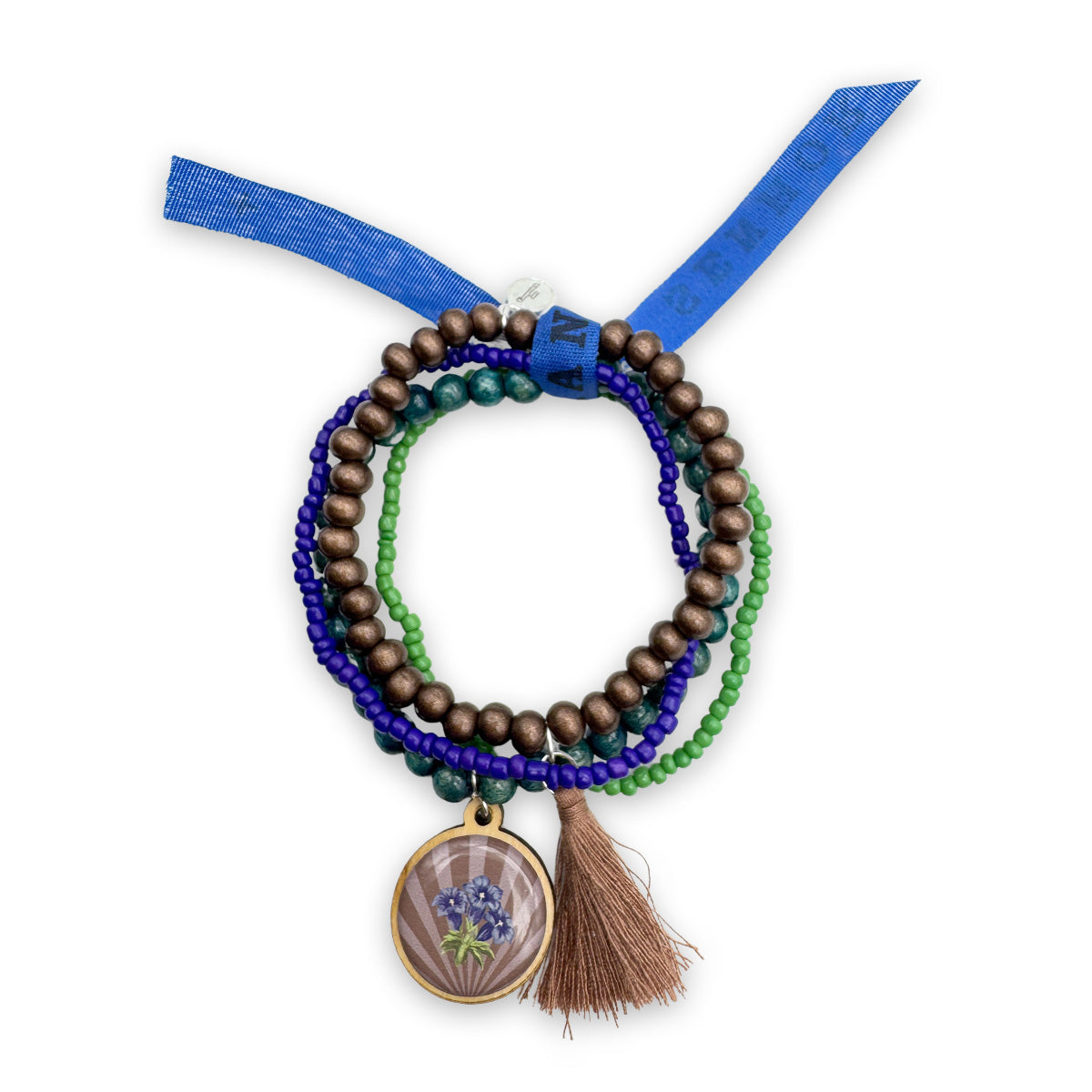 Armbandset in Blau-, Braun und Grüntönen aus Holzperlen und Glasperlen...Mit Quaste, Bonfimband und Enzian Holzpin
