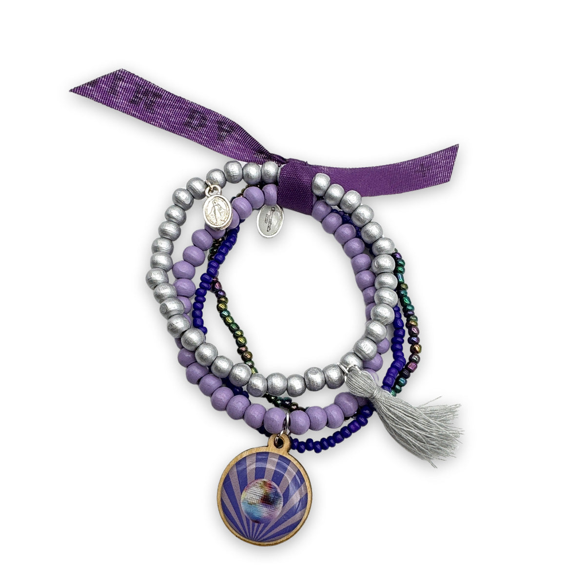 Armbandset in Fliedertönen aus Holzperlen und Glasperlen...Mit Quaste, Bonfimband und Spiegelkugel Holzpin