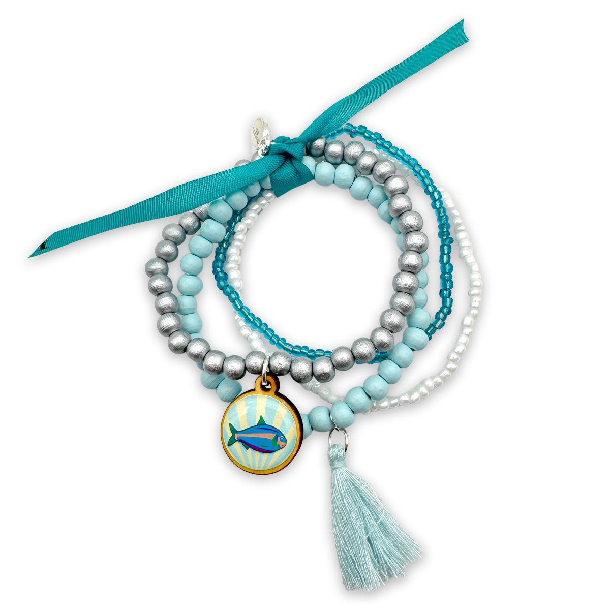 Armbandset in Hellblau-Silbertönen aus Holzperlen und Glasperlen...Mit Quaste, Bonfimband und Holzpin