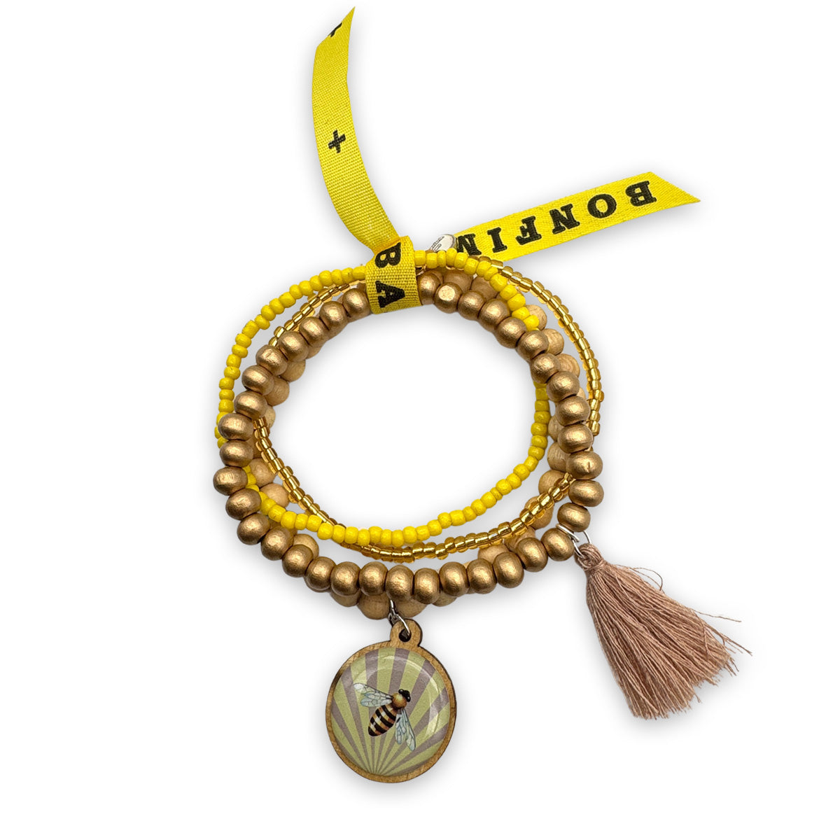 Armbandset in den Sommertönen Gelb, Gold und Natur aus Holzperlen und Glasperlen...Mit Quaste, Bonfimband und Biene Holzpin