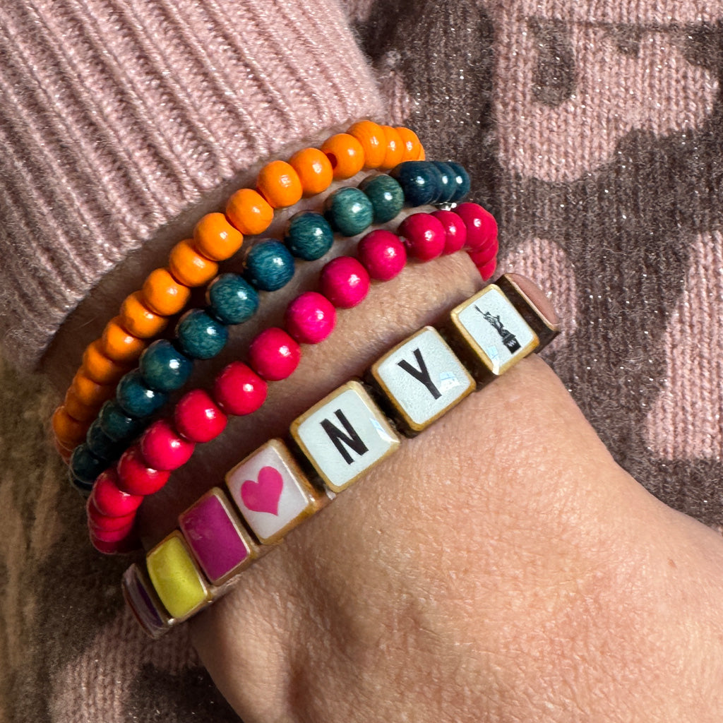 Buntes elastisches Escapulario Holzarmband mit pastelliger Farbabfolge und NY Schriftzeichen.