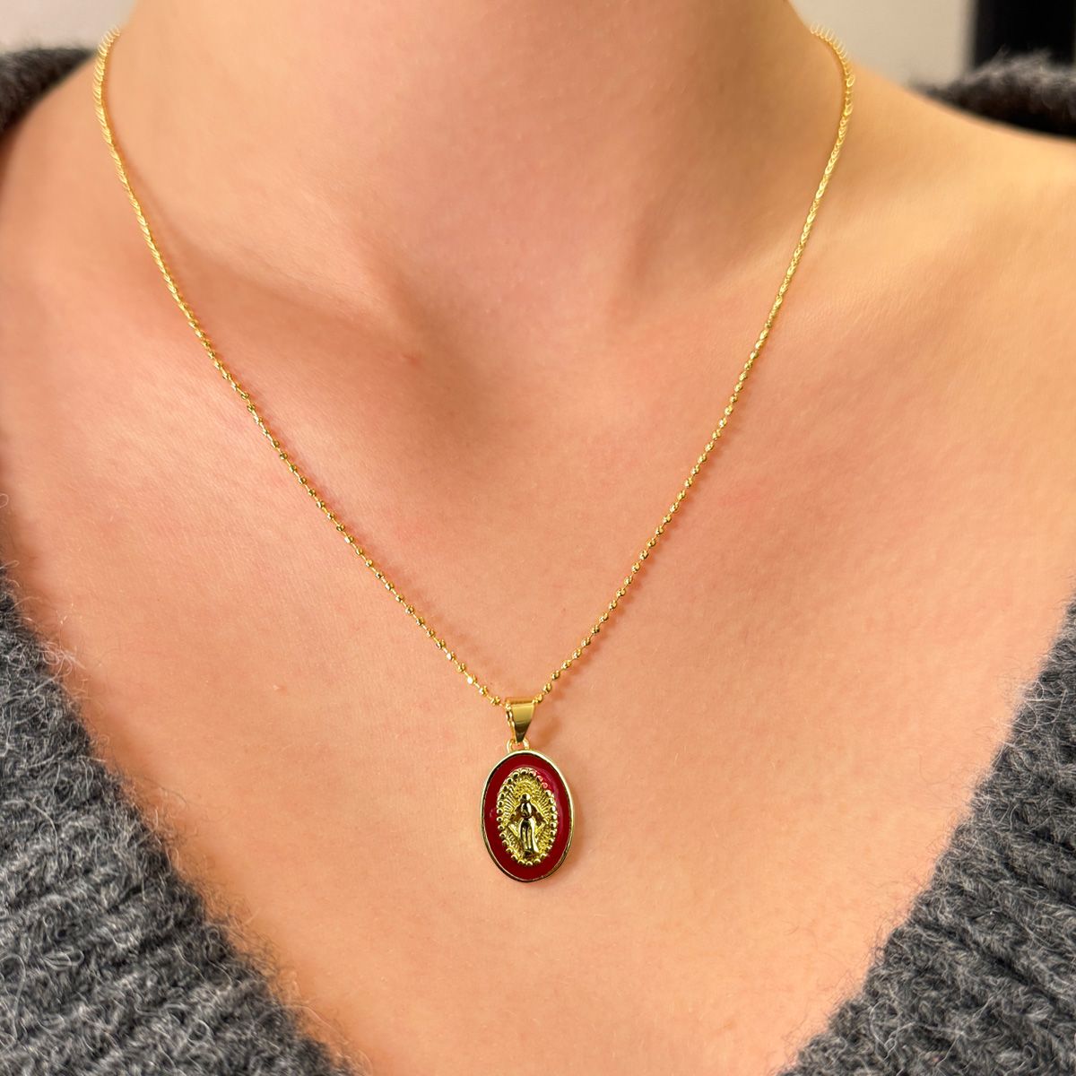 Diese feine, vergoldete Halskette mit einem Madonna-Anhänger in tiefem Dunkelrot ist ein edler Begleiter für jeden Anlass. Die ca. 20 cm lange Kette schmiegt sich zart an den Hals und lässt den dunkelroten Anhänger elegant hervortreten. Mit ihrer Kombination aus kräftiger Farbe und spiritueller Symbolik verleiht diese Kette Ihrem Look eine besondere Ausstrahlung und eine zeitlose, elegante Note. Perfekt für besondere Momente oder als stilvolles Statement im Alltag.