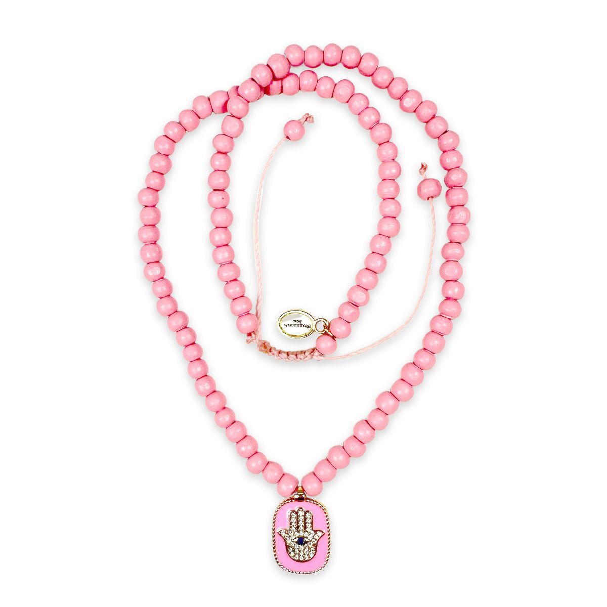 Willkommen in unserem Online-Shop, wo wir stolz eine einzigartige und stilvolle verstellbare Kette präsentieren: eine handgefertigte Kreation aus 6 mm großen Holzperlen in einem zarten Rosa-Ton, kombiniert mit einem emaillierten Hamsa-Anhänger.
