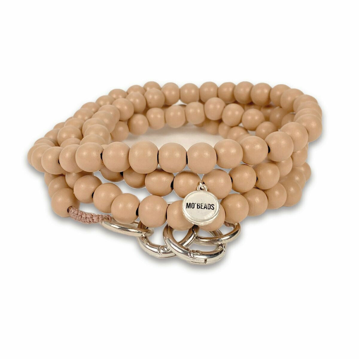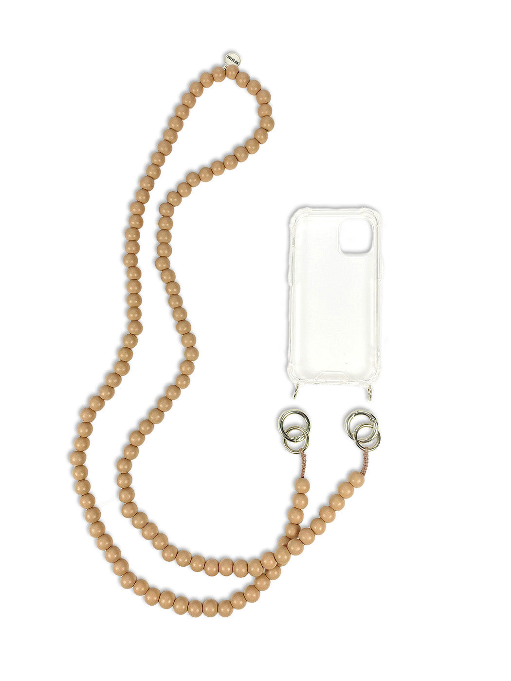 Die Handykette aus 112 gefärbten Holzperlen in elegantem Beige.