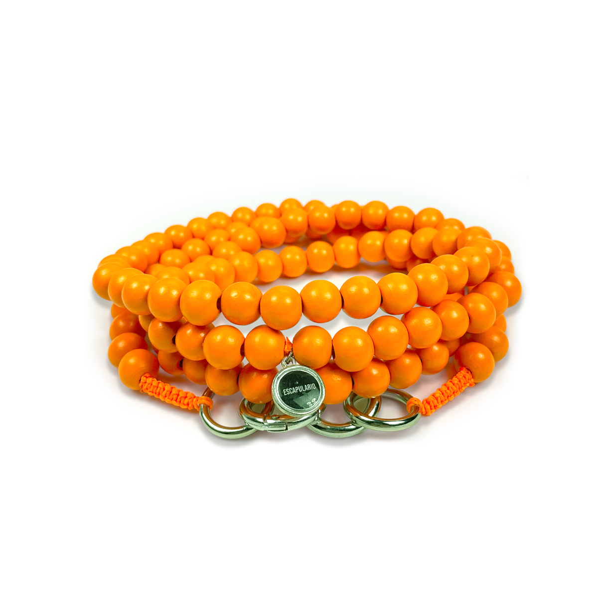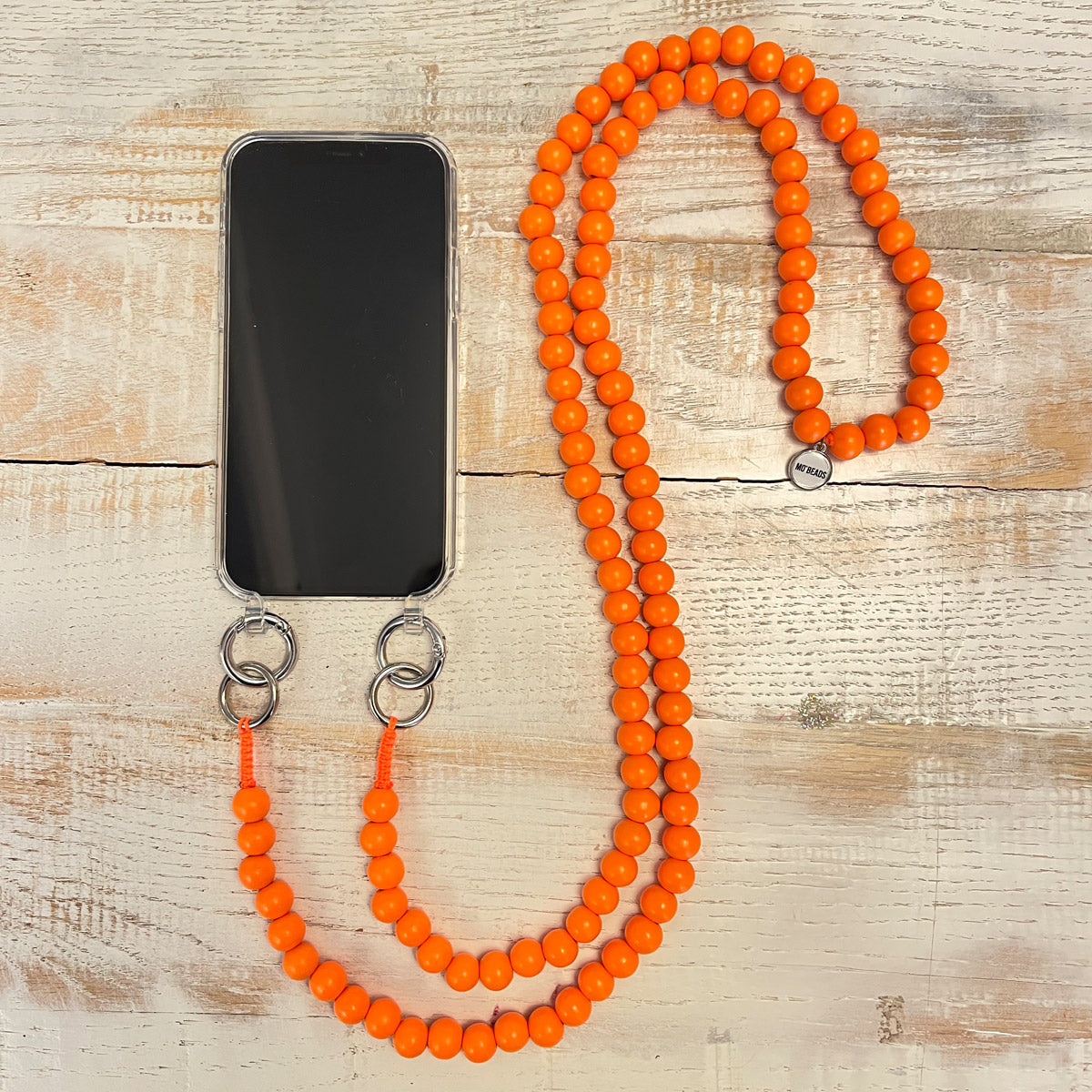 Die Handykette aus 116 gefärbten Holzperlen in sommerlichen Electric Orange.