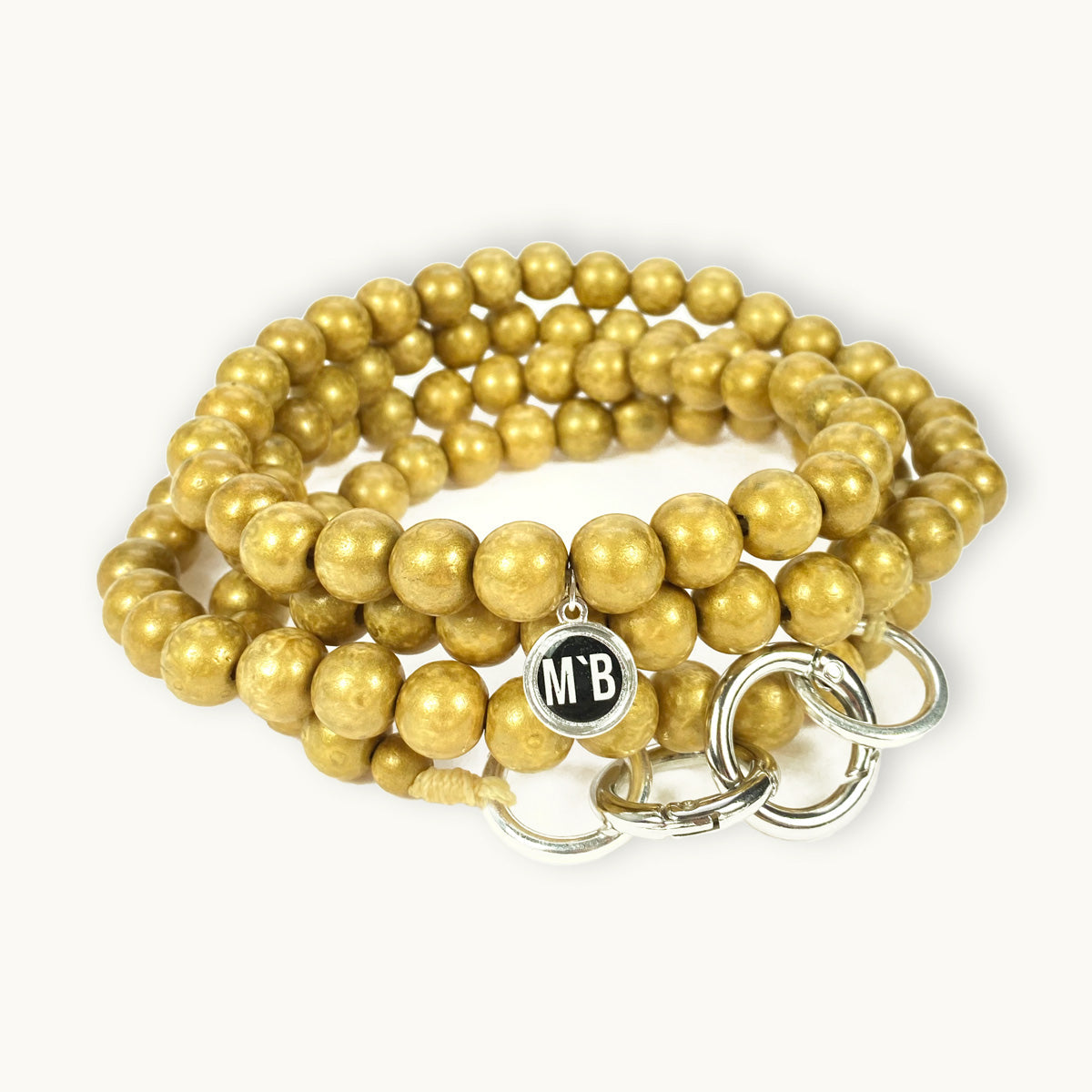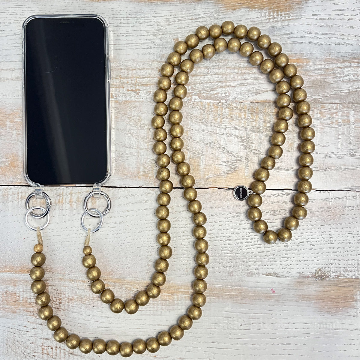 Die Escapulario Handykette aus 108 gold gefärbten Holzperlen mit Holzstruktur. Die Handykette hat eine Länge von 130 cm, ist handgeknüpft in Deutschland, auf einen hochwertigen gewachsten Baumwollfaden aufgefädelt und ist durch zwei Taschenringe mit Klickverschluss kinderleicht mit ihrem bestehenden Handykettencover zu wechseln. Die Handykette variiert durch ihre spezielle Färbung in der Farbe und entwickelt dadurch ihren eigenen Charme. Angeboten wird nur die Handykette ohne Cover.