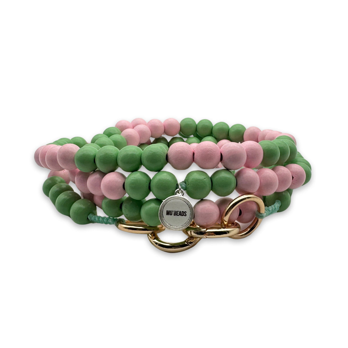 Diese einzigartige Handykette besteht aus 12 mm großen Holzperlen, die in zwei verschiedenen Farben gestaltet sind: halb in einem knalligen Mint und halb in einem zauberhaften Rosa. Die Farben bilden eine auffällige und dennoch harmonische Kombination, die jedem Outfit eine fröhliche Note verleiht.