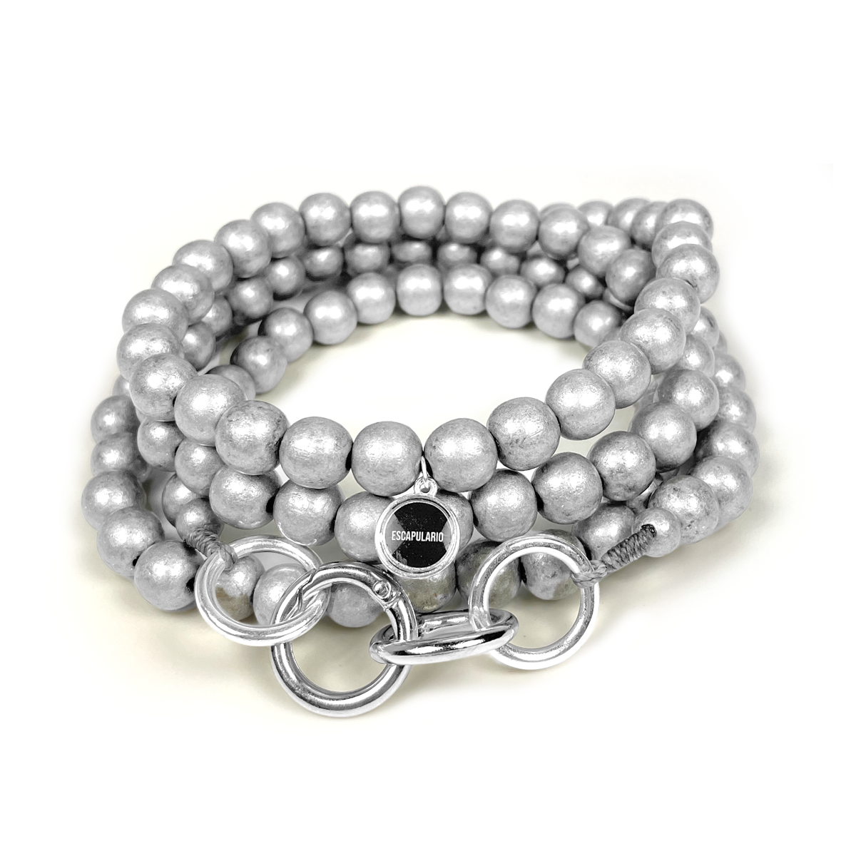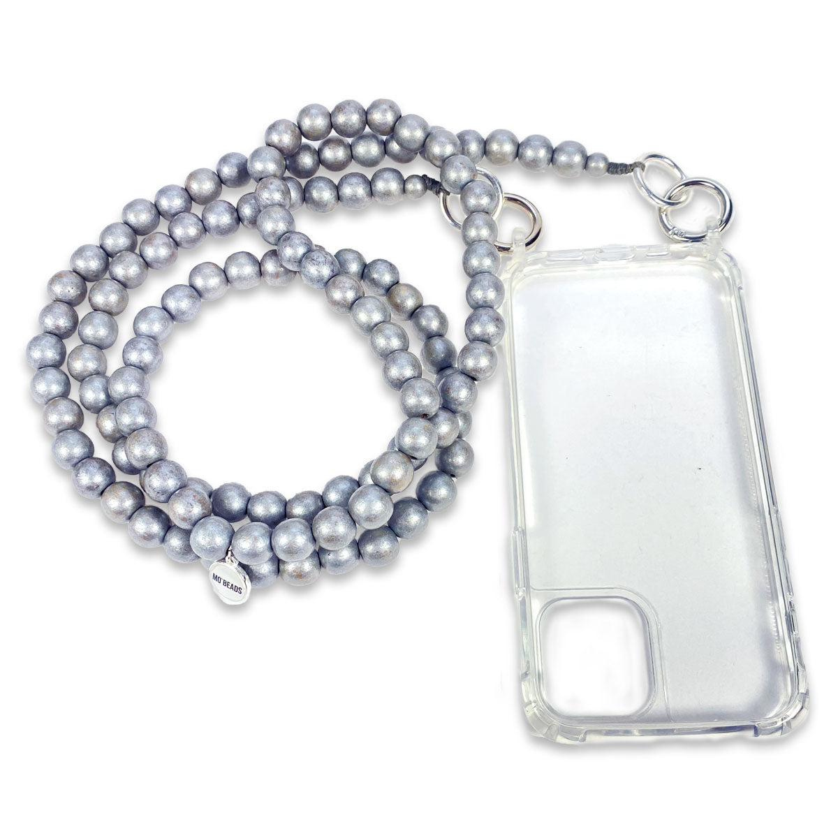 Die Handykette aus 108 gefärbten Holzperlen in Silber.