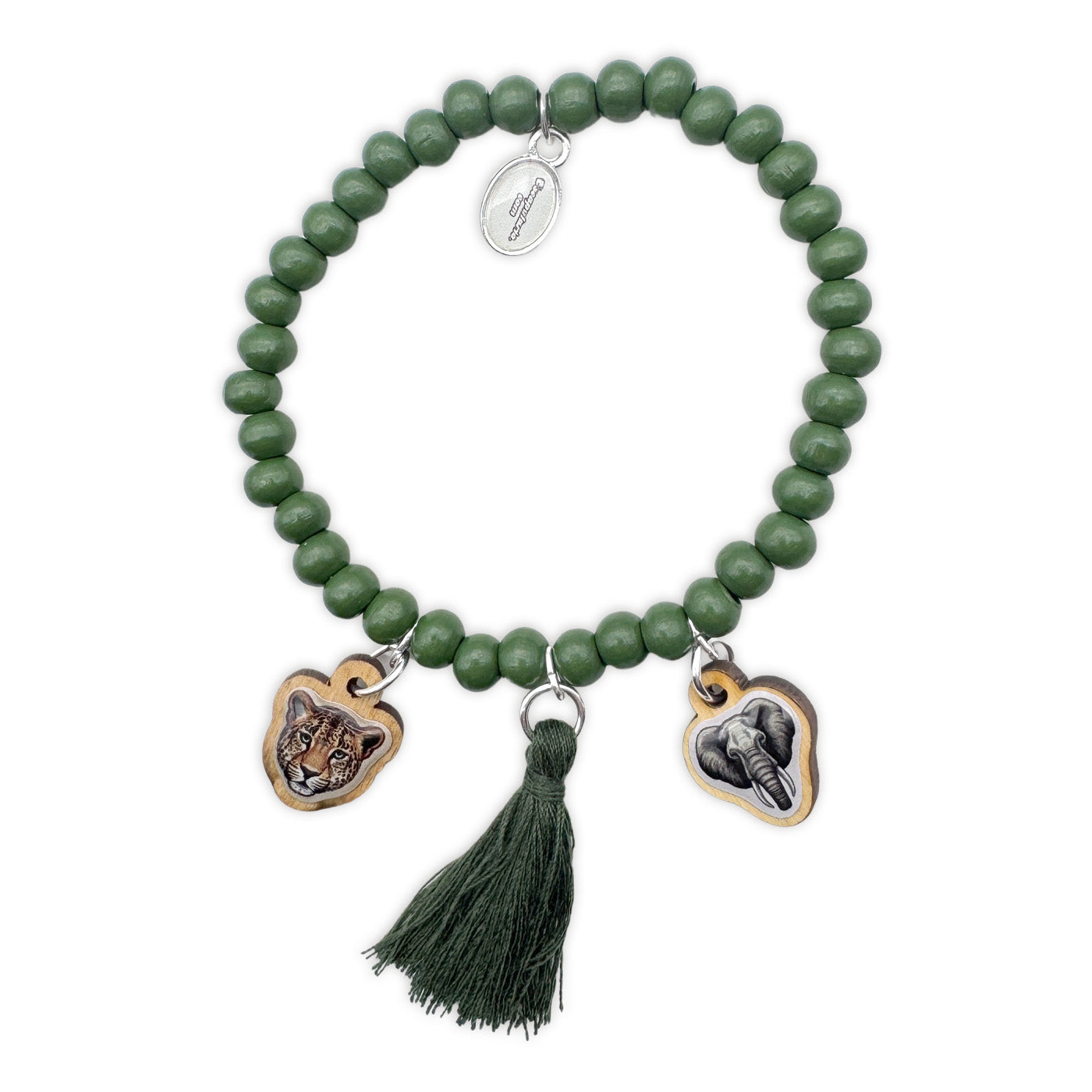 Holzarmband aus 6 mm Perlen in Bambusgrün mit einem Leopardenkopf und Elefant als Holzpin. Variiert wird das ganze mit einer Quaste.