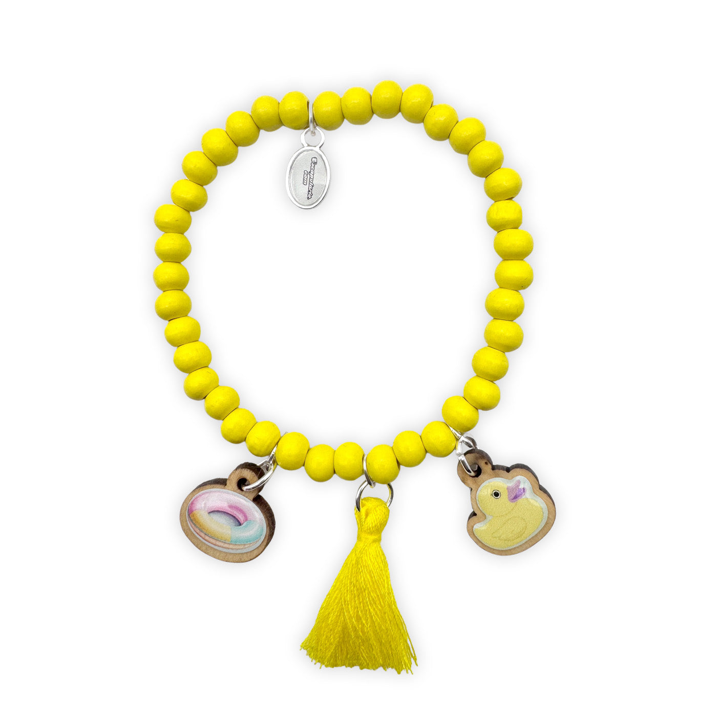 Holzarmband aus 6 mm Perlen in leuchtendem Gelb mit einer kleinen Badeente als Holzpin. Veriert wird das ganze mit einer gelben Quaste.