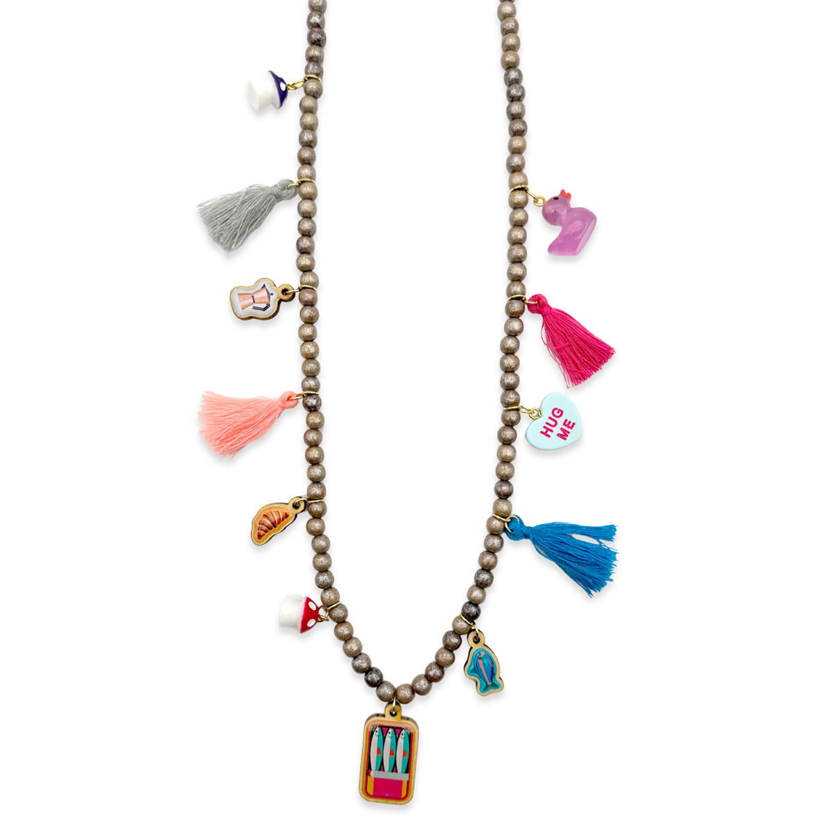 Holzkette 6mm in Braun-Metallic mit 4 Pins, 5 Quasten, Herz, Ente & Pilz