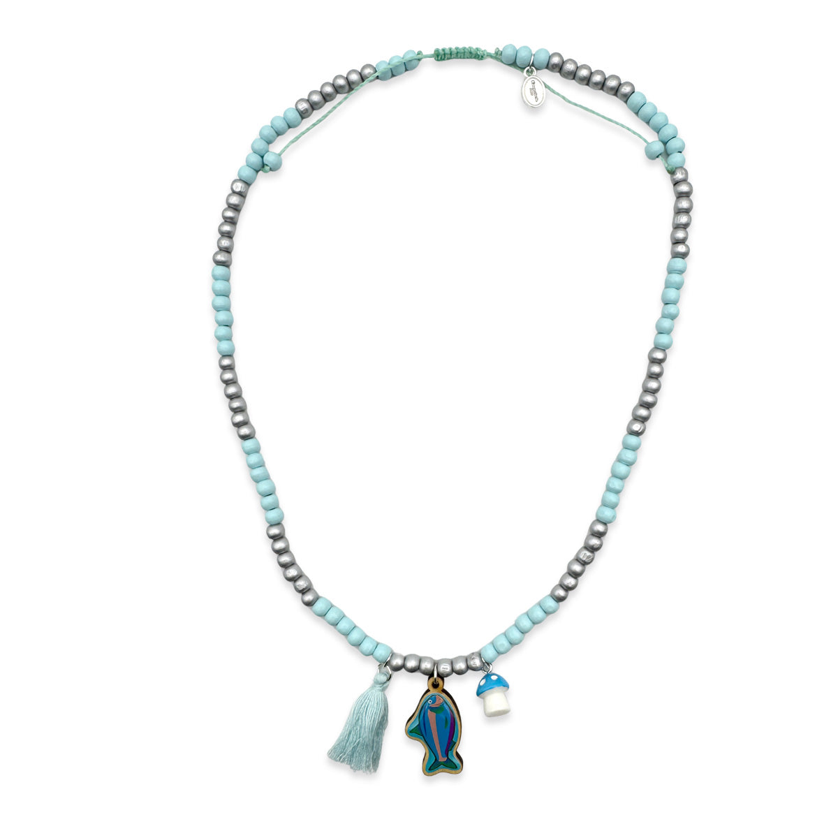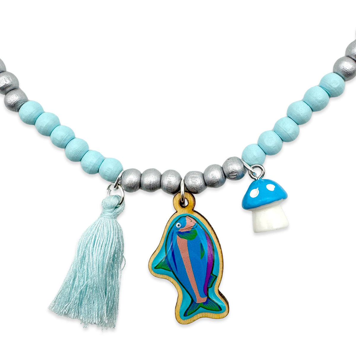 Holzkette 6mm in Hellblau-Silber mit Pin (Fisch), Quaste & Pilz