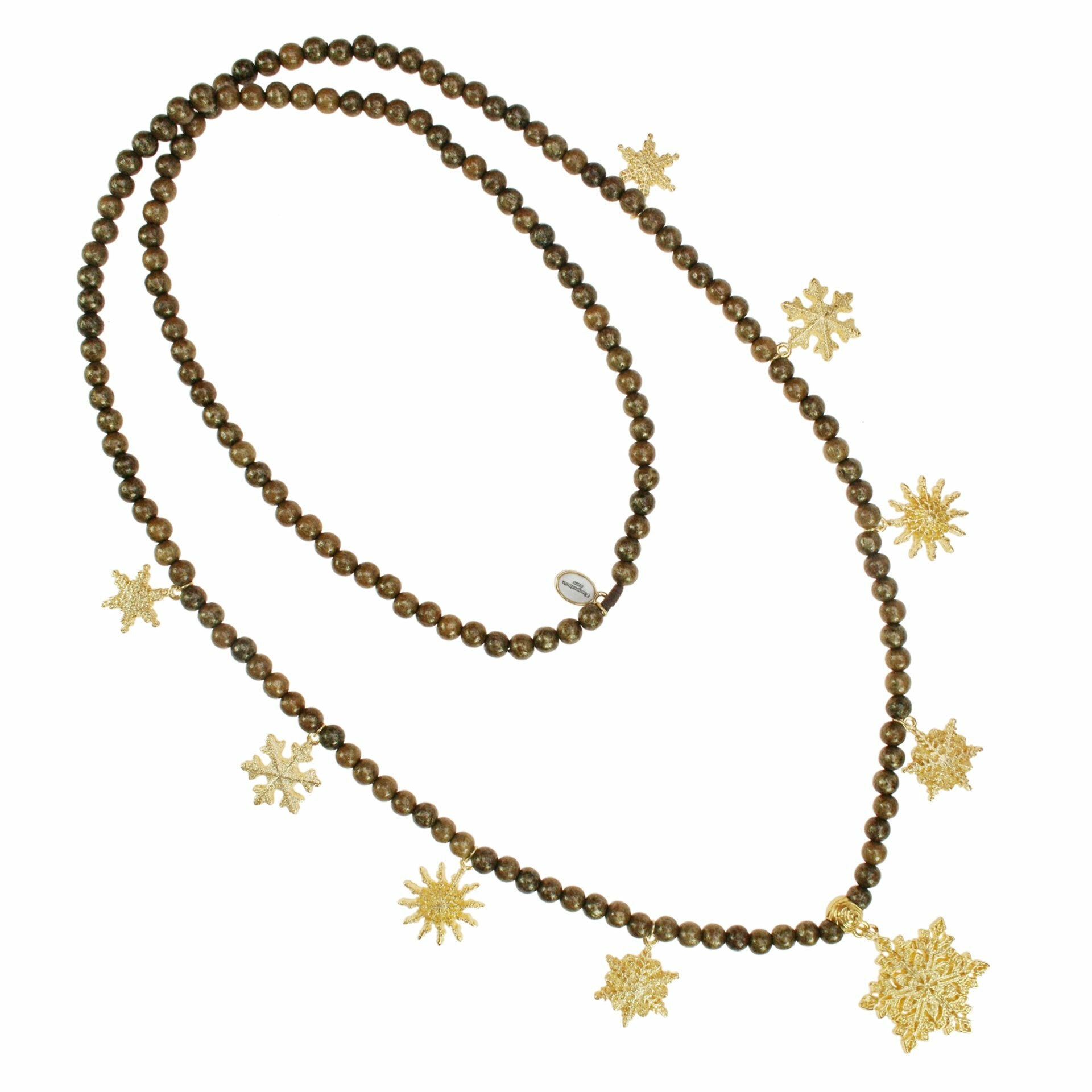 Braune lange Holzkette mit goldenen Schneekristallanhängern