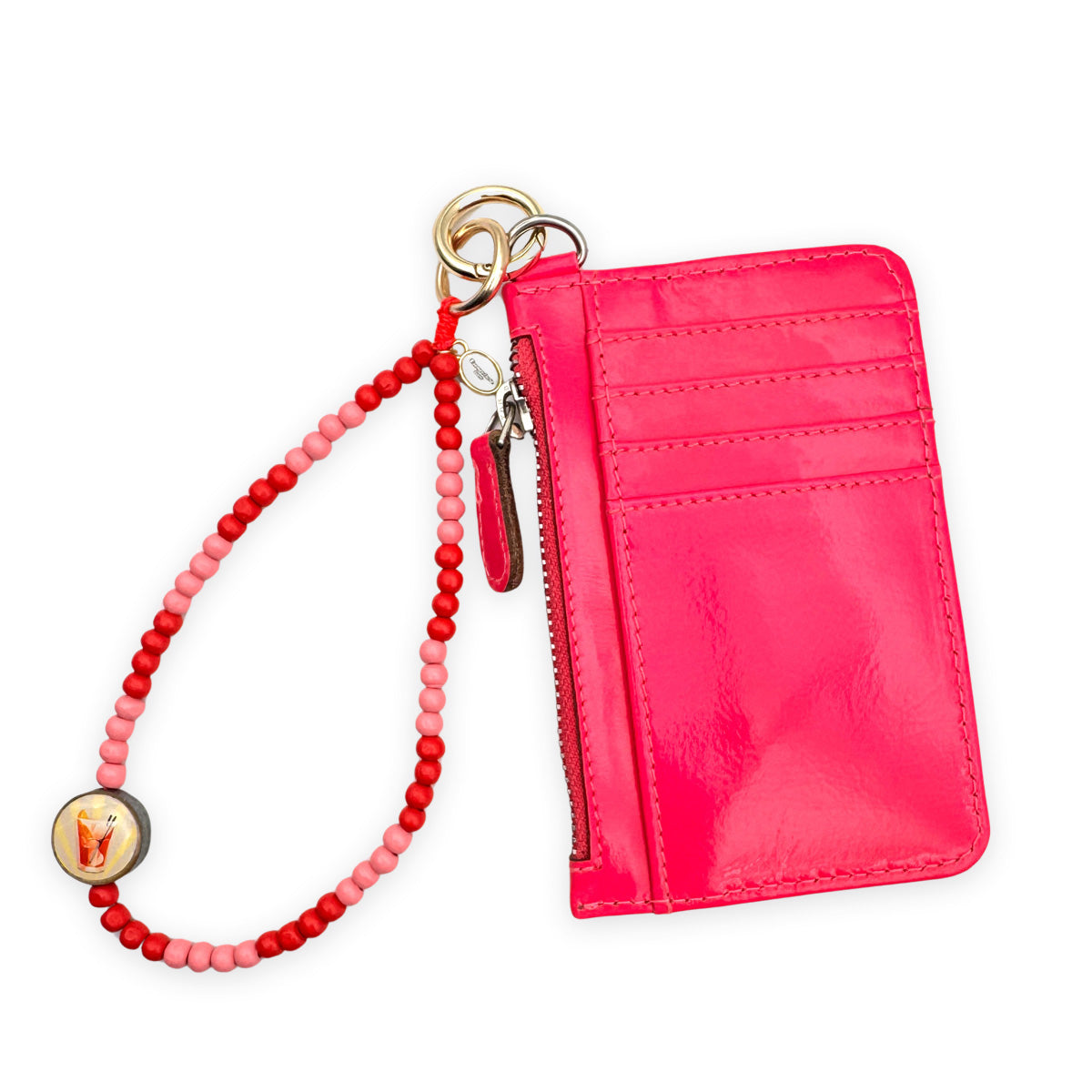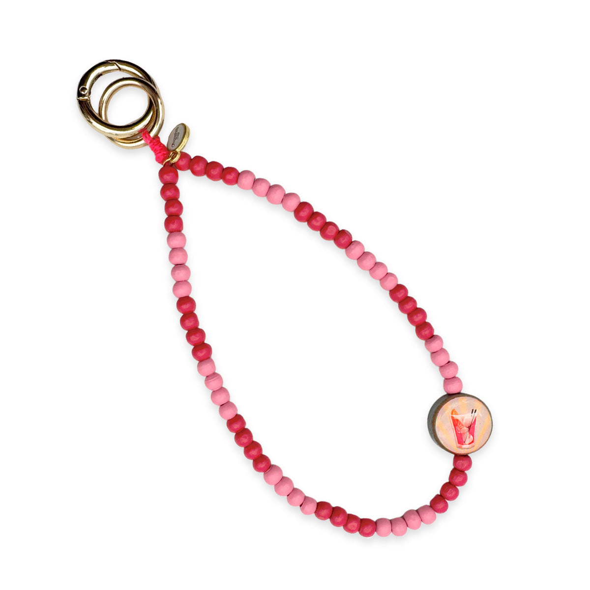Unsere neueste kurze Handykette mit Apricot-Korallefarbenen 6mm Holzperlen und bedruckter Printscheibe, mit Streifen-Longdrinkmotiv,hat eine Länge von ca. 20 cm und ist handgeknüpft. Sie ist auf einem hochwertigen gewachsten Baumwollfaden aufgefädelt und durch einen goldenen Taschenring mit Klickverschluss kinderleicht mit ihrem bestehenden Handykettencover oder Universalplättchen zu verbinden.