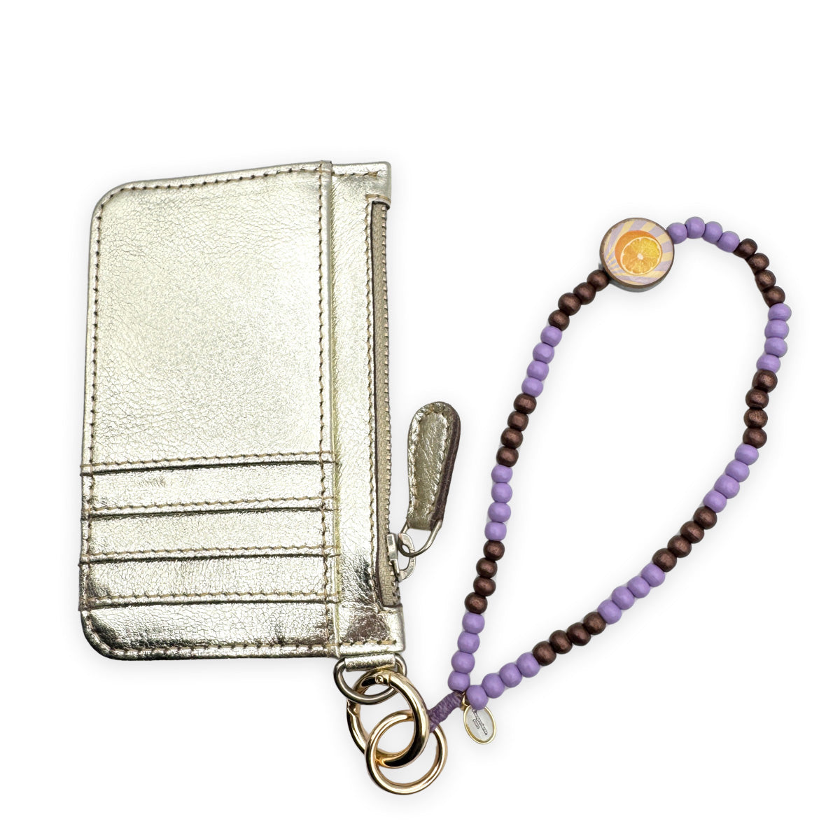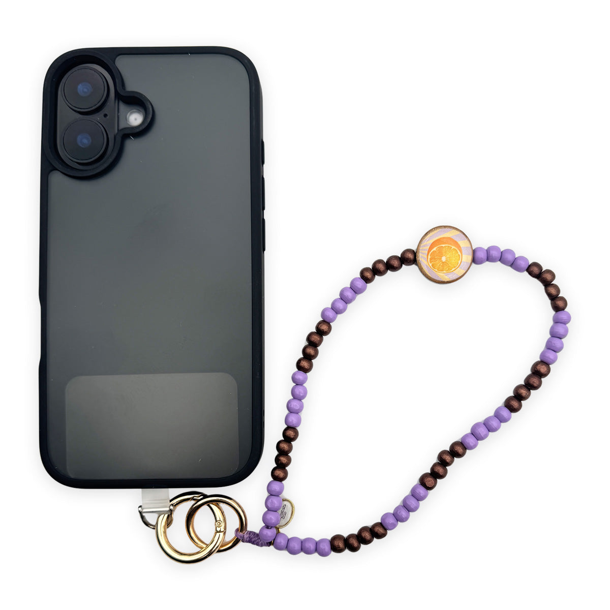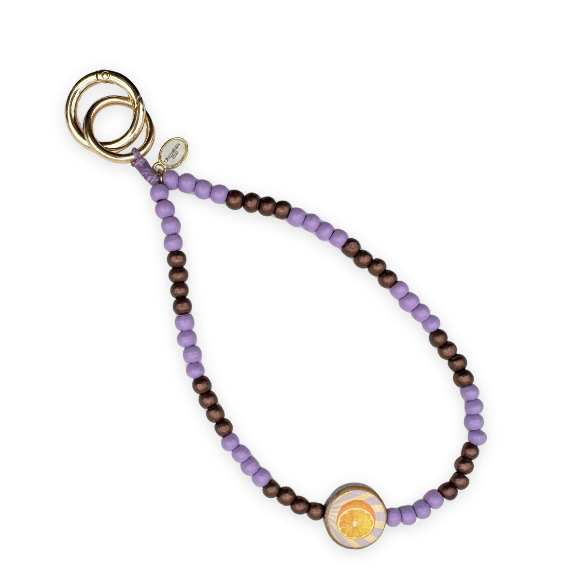 Unsere neueste kurze Handykette mit flieder-bronzenen 6mm Holzperlen und bedruckter Printscheibe, mit Streifen-Orangenmotiv,hat eine Länge von ca. 20 cm und ist handgeknüpft. Sie ist auf einem hochwertigen gewachsten Baumwollfaden aufgefädelt und durch einen goldenen Taschenring mit Klickverschluss kinderleicht mit ihrem bestehenden Handykettencover oder Universalplättchen zu verbinden.