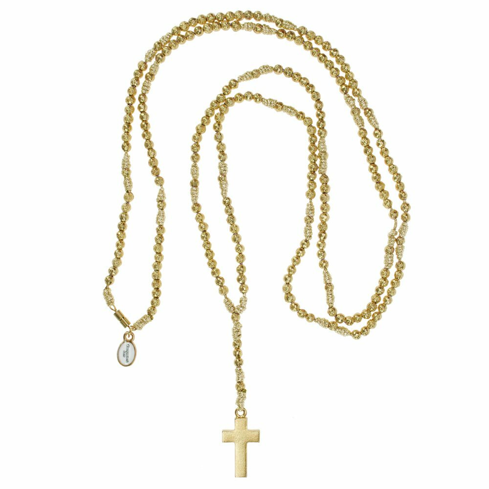 Escapulario Kette in traditioneller Rosenkranz-Knüpftechnik aus einer goldenen Glitzerkordel und goldfarbenen Perlen in Rosenoptik mit einem Kreuz-Anhänger.