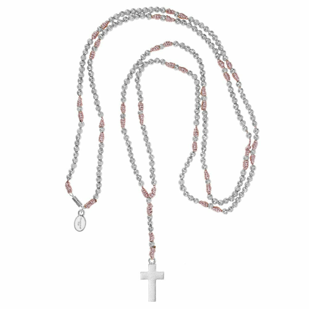 Escapulario Kette in traditioneller Rosenkranz-Knüpftechnik aus einer rosanen Glitzerkordel und silberfarbenen Perlen in Rosenoptik mit einem Kreuz-Anhänger.