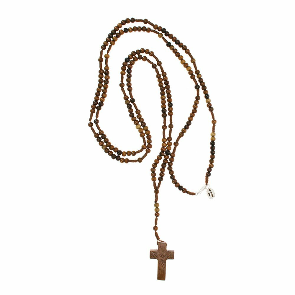 Ein Klassiker aus unserer Kollektion. Lange Rosenkranz Kette aus schwarzen Holzperlen, lang genug um sie auch doppelt um den Hals zu legen.