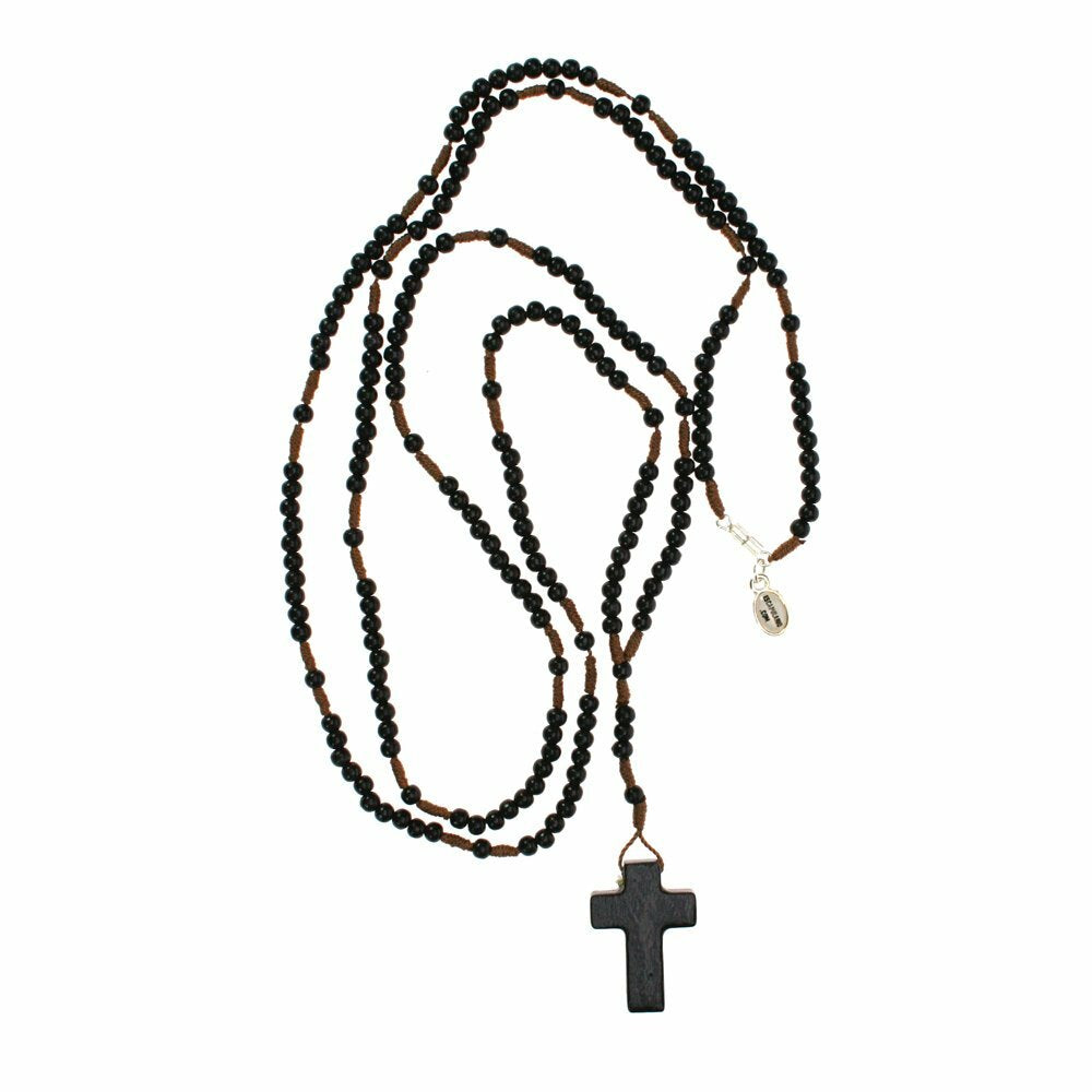 Ein Klassiker aus unserer Kollektion. Lange Rosenkranz Kette aus schwarzen Holzperlen, lang genug um sie auch doppelt um den Hals zu legen.
