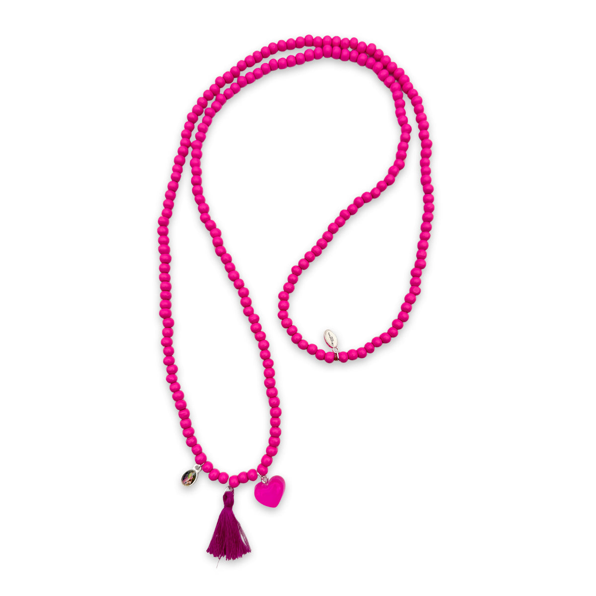 Entdecken Sie diese charmante Halskette im Escapulario-Stil, gefertigt aus 6mm Holzperlen in knalligem Pink. Ein transparenter Acrylherz-Anhänger und eine stilvolle Quaste verleihen dem Design eine elegante Note. Der Madonna-Anhänger rundet die Kette ab und verleiht ihr einen spirituellen Touch. Die Kettenlänge beträgt ca. 52 cm und sitzt getragen auf etwa 36 cm – perfekt, um jedem Outfit eine besondere Bedeutung und Stil zu verleihen.