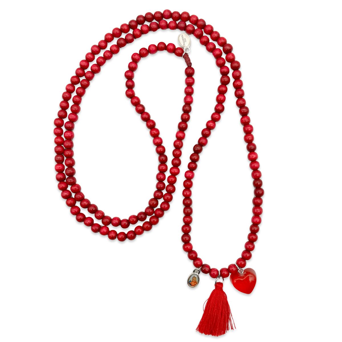 Diese elegante Halskette im Escapulario-Stil besticht durch 6mm Holzperlen in einem stilvollen Rot, das Stärke und Leidenschaft verkörpert. Ein transparenter Acrylherz-Anhänger und eine passende rote Quaste ergänzen das Design und schaffen eine harmonische Farbgebung. Der Madonna-Anhänger verleiht der Kette eine spirituelle Tiefe und den charakteristischen Escapulario-Look. Mit einer Gesamtlänge von ca. 52 cm und einer getragenen Länge von etwa 36 cm ist diese Kette ein stilvolles Accessoire, das jedem Outfit eine besondere Bedeutung verleiht.