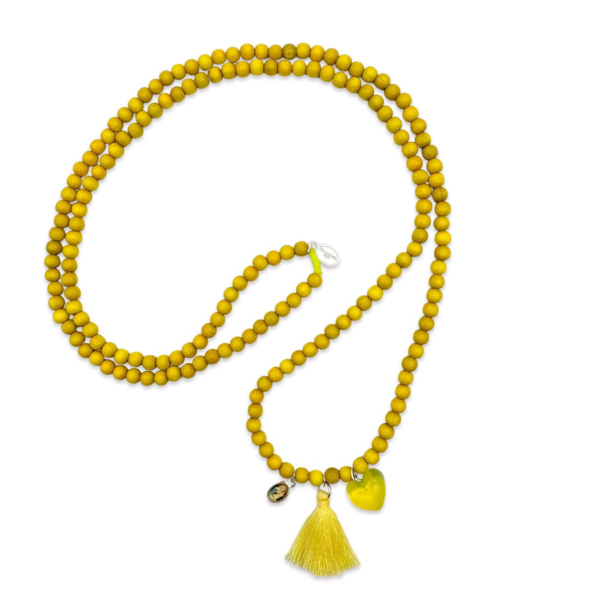 Diese einzigartige Halskette im Escapulario-Stil bringt sonnige Energie in Ihren Look. Hergestellt aus 6mm Holzperlen in strahlendem Sonnengelb, kombiniert sie ein transparentes Acrylherz und eine leuchtend gelbe Quaste für einen frischen, lebhaften Touch. Ein Madonna-Anhänger vervollständigt das Design und verleiht der Kette eine spirituelle Note. Mit einer Gesamtlänge von ca. 52 cm, sitzt sie getragen auf etwa 36 cm und verleiht jedem Outfit einen Hauch von Wärme und Bedeutung.