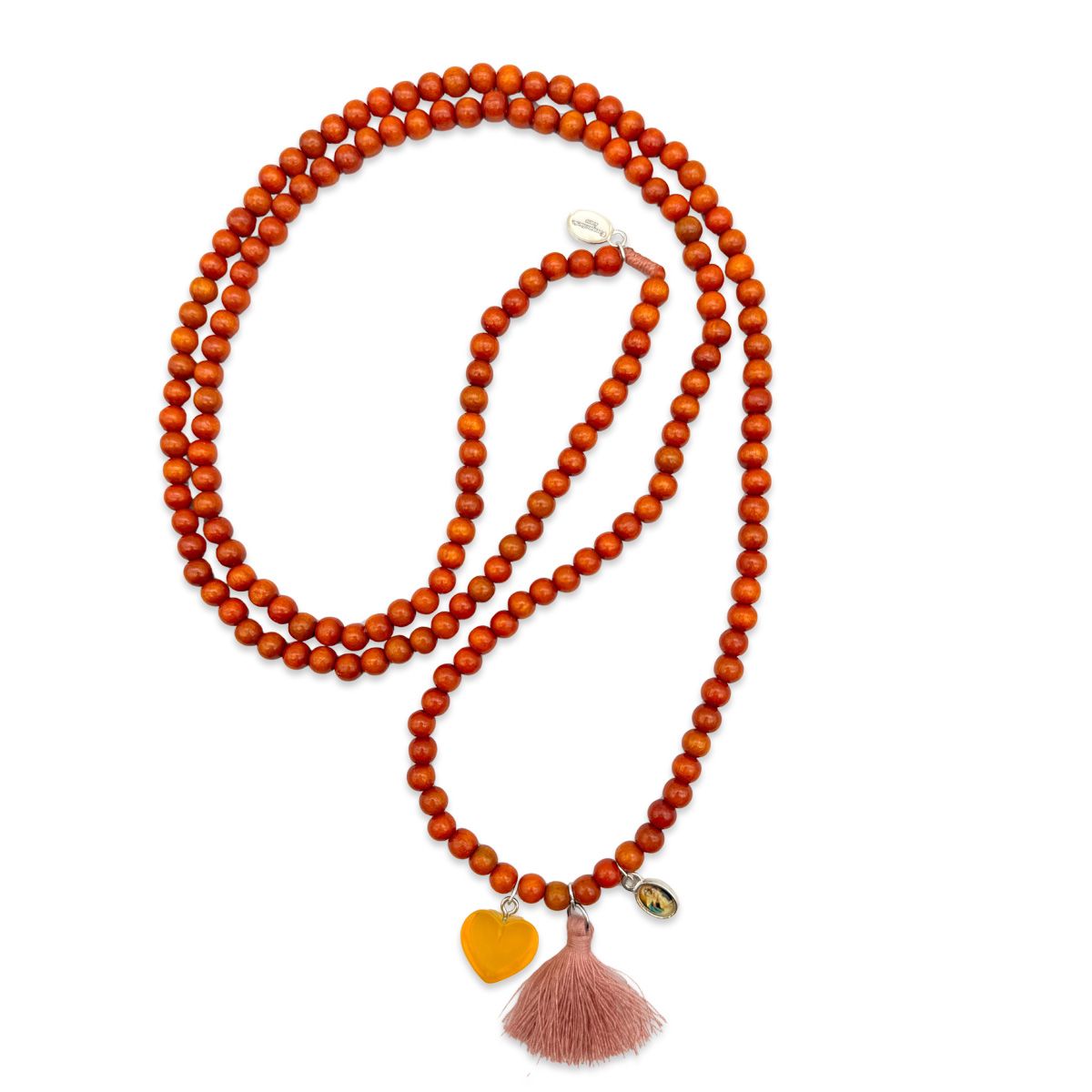 Diese stilvolle Halskette im Escapulario-Stil strahlt mit ihren 6mm Holzperlen in warmem Terracotta-Orange pure Lebensfreude aus. Ein transparenter Acrylherz-Anhänger in Orange und eine altrosa Quaste verleihen dem Design eine harmonische Farbkombination und einen sanften, eleganten Akzent. Der Madonna-Anhänger rundet die Kette ab und bringt eine spirituelle Note mit sich. Mit einer Gesamtlänge von ca. 52 cm liegt sie getragen bei etwa 36 cm und verleiht Ihrem Outfit einen warmen, besonderen Touch.