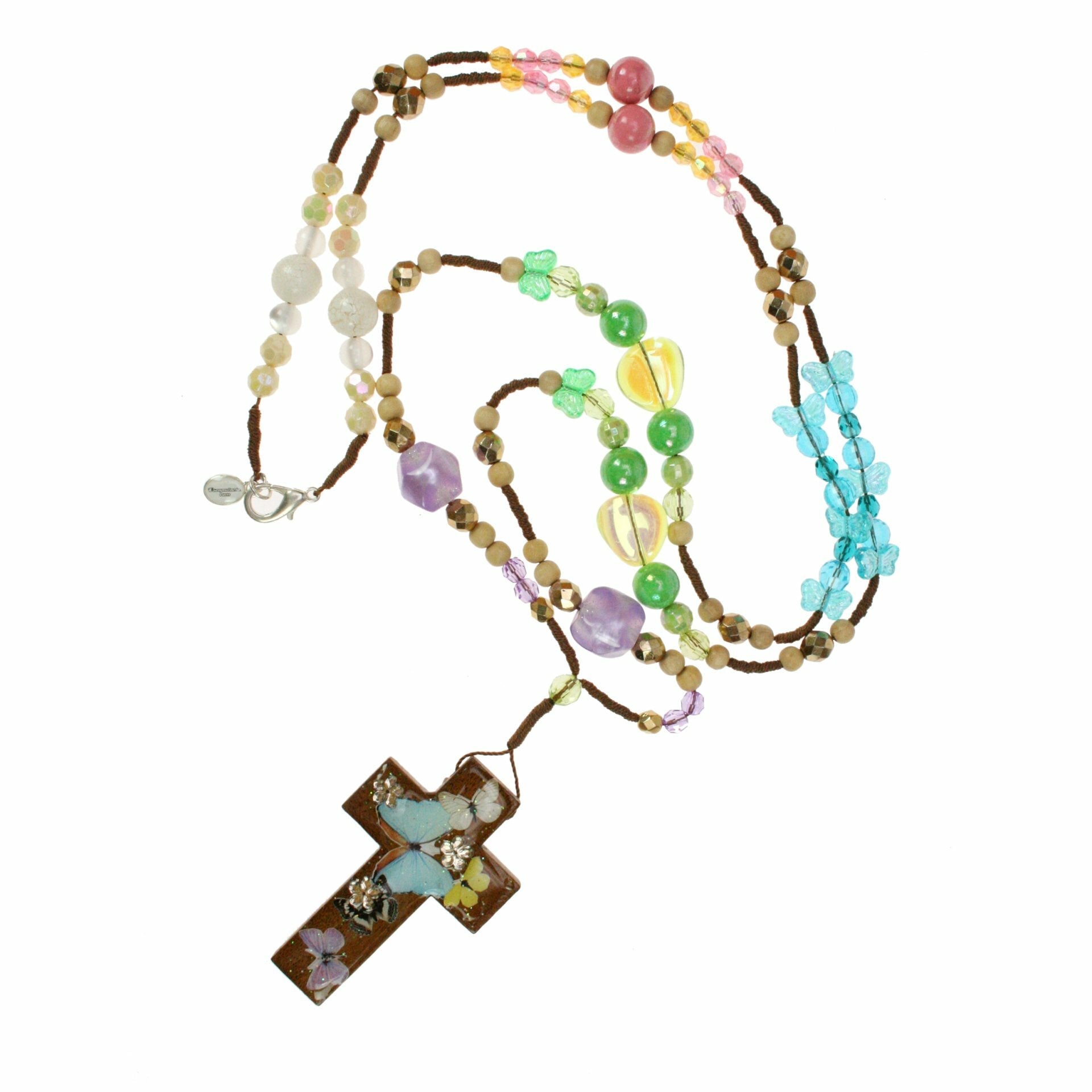 Rosenkranzkette bunt mit Holzkreuz braun "Schmetterlinge"