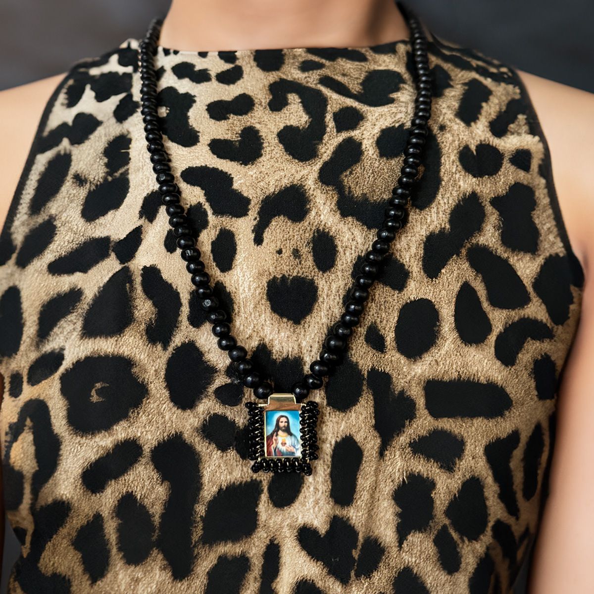 Diese edle Holzkette besteht aus 6 mm großen, schwarzen Perlen und besticht durch ihren einzigartigen, spirituellen Look. Der vergoldete Anhänger zeigt ein detailreiches Jesusmotiv, das von einer stilvollen Perlenumrandung umgeben ist und dem Schmuckstück eine besondere Eleganz verleiht. Ein ideales Accessoire für Liebhaber spiritueller Schmuckstücke und für alle, die ein Statement setzen möchten. Die Kette passt sowohl zu lässigen Outfits als auch zu festlicheren Anlässen und verleiht jedem Look eine spirituelle und moderne Note.