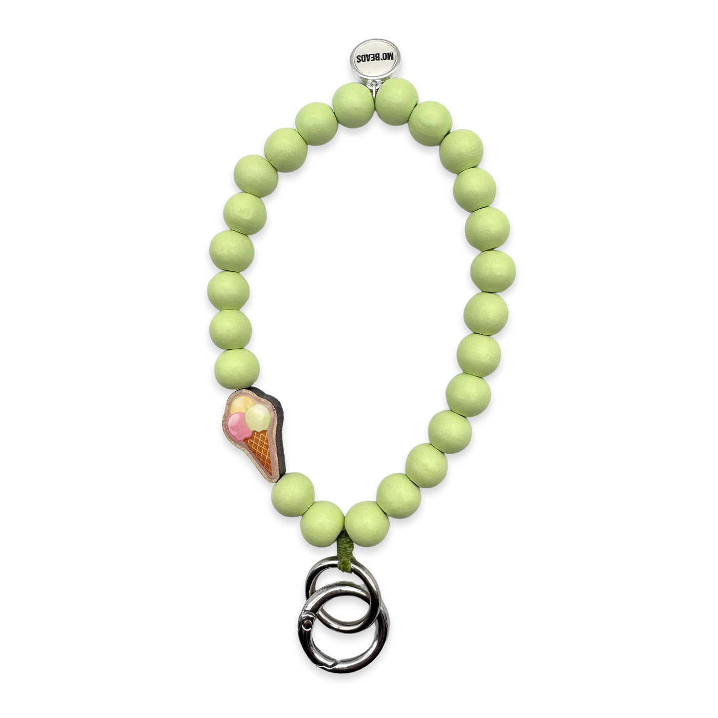 Die Schlüsselkette ist handgeknüpft und wird mit 26 gefärbten Holzperlen aufgefädelt.