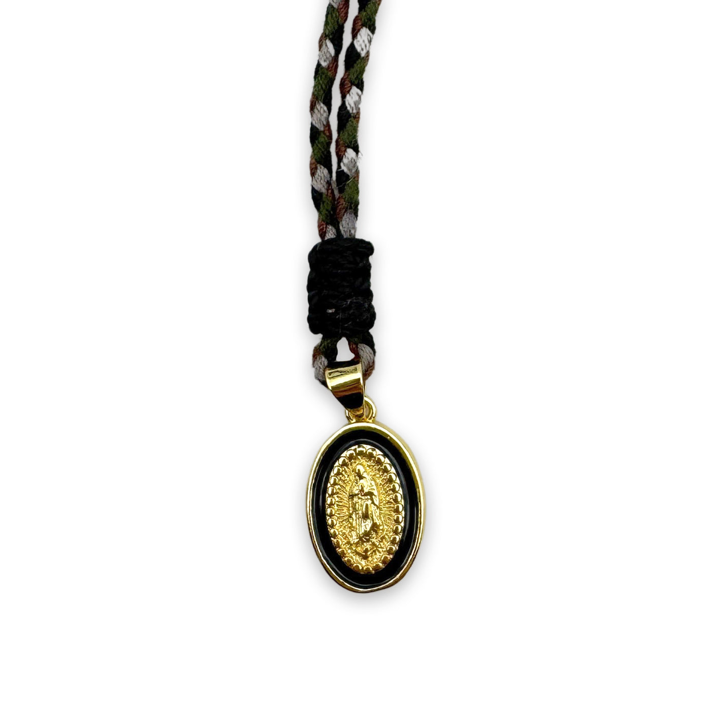 Kette aus Baumwollstring in schwarz, silber mit kleinem Madonna-Anhänger in Gold mit schwarzer Outline..