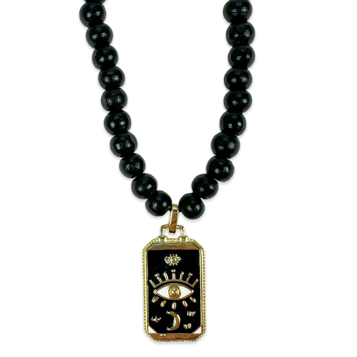 Symbol Kette aus bunten 6mm Holzperlen in schwarz mit emaillierten Symbol-Anhänger in Gold gefasst.