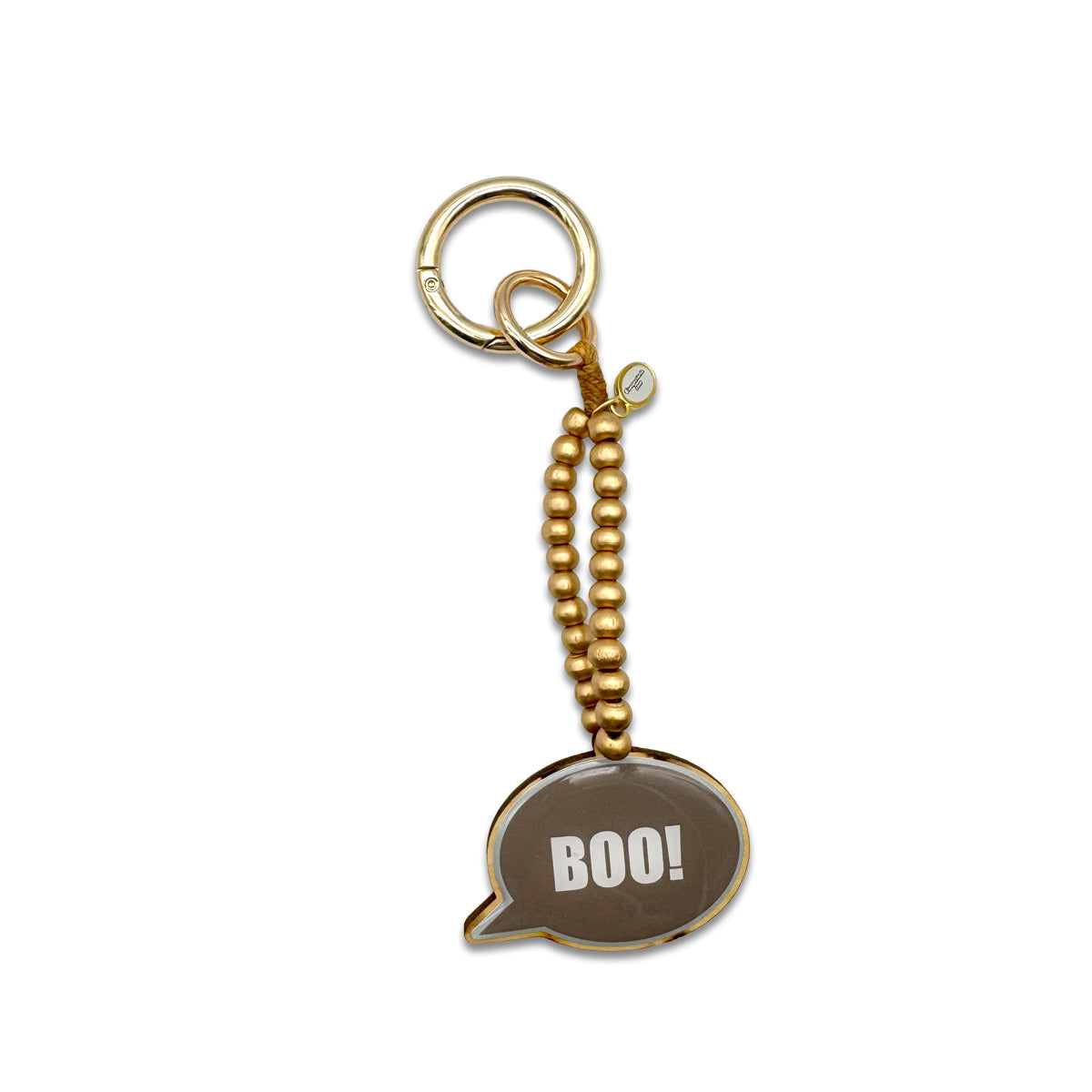 Verleihen Sie Ihrer Tasche einen einzigartigen Look mit unserer Taschenkette aus bunten Holzperlen und einem Boo Holzpin. Diese Kette, mit 6mm Holzperlen in Gold ist ca. 15cm lang Incl. Karabiner und lässt sich auch toll als Schlüsselkette verwenden