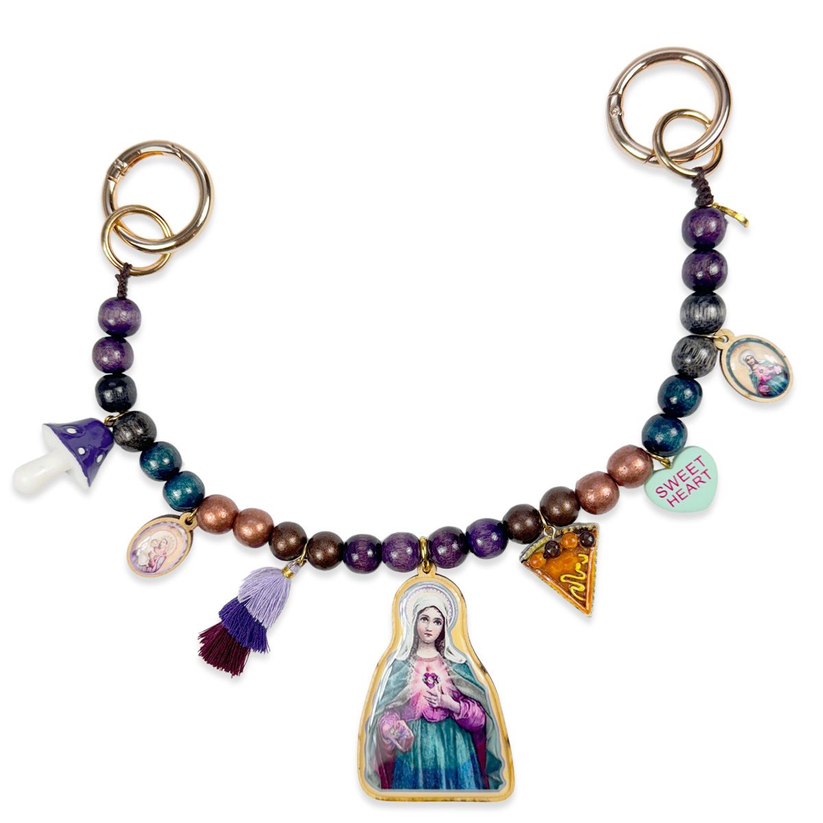 Verleihen Sie Ihrer Tasche einen einzigartigen Look mit unserer Taschenkette aus bunten Holzperlen und einem kunstvollen Madonnamotiv. Diese außergewöhnliche Kette ist mit verschiedenen Lucky Charms versehen, darunter ein lila Pilz, ein "Be Mine"-Herz, ein Kuchenstück, eine Quaste und zwei Heiligenanhänger.