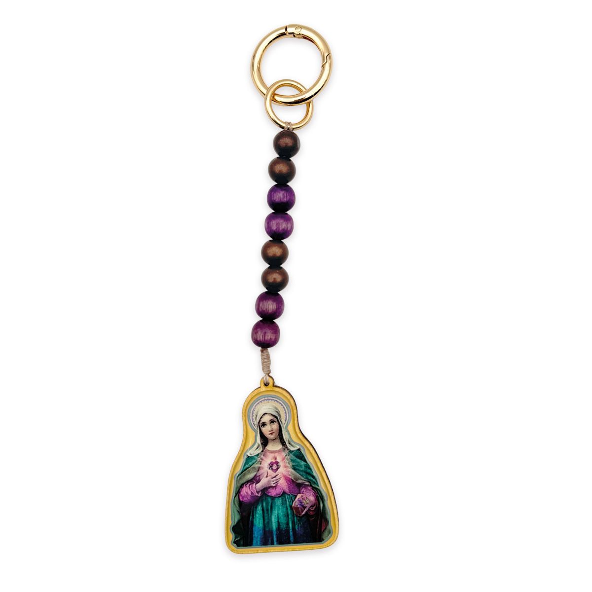 Verleihen Sie Ihrer Tasche einen einzigartigen Look mit unserer Taschenkette aus bunten Holzperlen und einem kunstvollen Madonnamotiv. Diese Kette, mit 8x 12mm Holzperlen in Lila und Bronze, ist ca. 20cm lang und lässt sich auch toll als Schlüsselkette verwenden