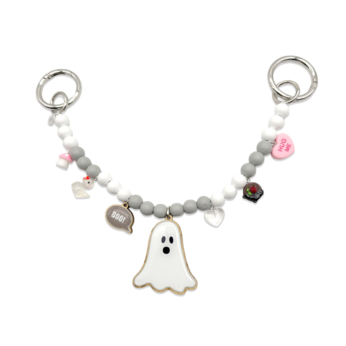Mit der Escapulario Taschenkette "Mrs Boo" bringst du die süßeste Gänsehaut an deine Tasche. Hellgraue und weisse Holzperlen (12 mm) mischen sich mit funky Charms: ein süßer Pilz, ein softes Acrylherz, ein kleiner Kuchen, ein transparentes Entchen, ein Holzpin und – natürlich – die Queen der Kette: die stylish schaurige Mrs Boo aus Holz! Zwei große silberfarbene Karabinerringe sorgen für den perfekten Halt an deiner Tasche.